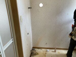 洗面脱衣室のリフォームを行う事にした。洗面台と給湯器ボイラーの交換。壁の雨漏りがあるようなので、壁をはがして断熱材を入れ替え、壁紙を張り替える。